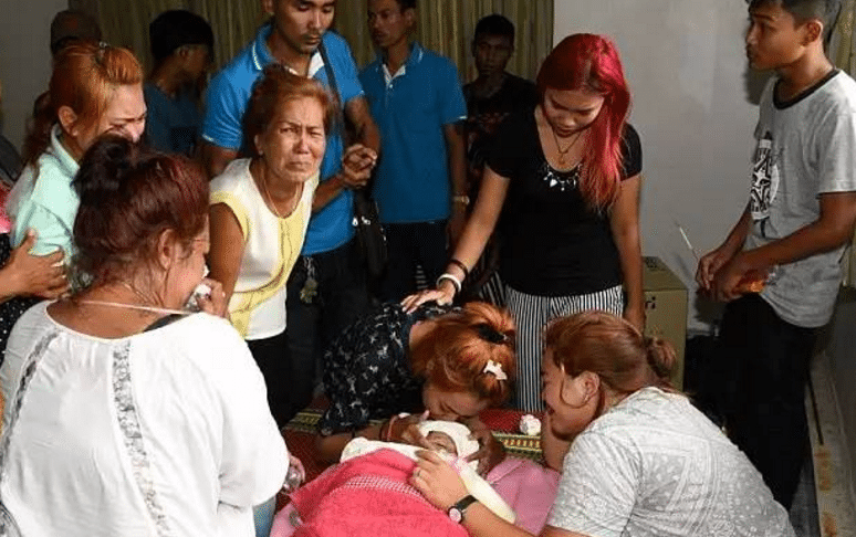 图为男子的妻子悲痛欲绝,附身亲吻孩子的遗体