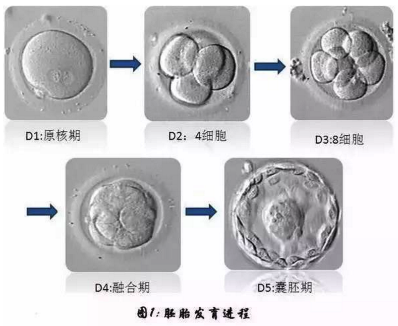 一般来说,胚胎的移植或是冷冻要么发生在第三天要么发生在第五天或第六天。卵子刚取出来,只是单细胞受精12-24小时后在培养液里发育并分裂,所以到第三天一般是6-8细胞的胚胎。而到第五天,大约发展成上百个细胞,此时胚胎也被称被囊胚。界于两者之间(一般是第四天),还有一个阶段叫桑葚胚,因桑葚胚比较难评级,一般不做评级。