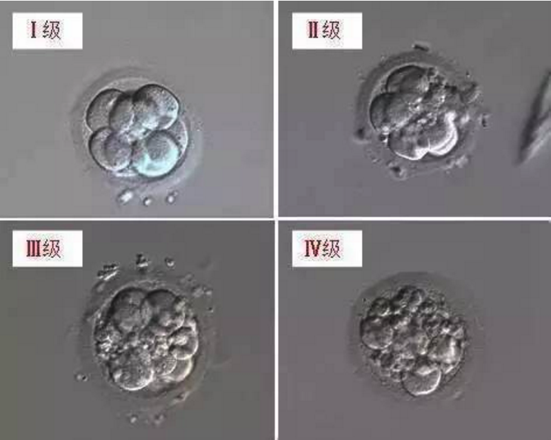 第一张(左上)图片,即为8细胞Ⅰ级的胚胎,简记为8Ⅰ。第二张(右上)图片,即为8细胞Ⅱ级的胚胎,简记为8Ⅱ。级别的好坏,依次是Ⅰ级>Ⅱ级>Ⅲ级>Ⅳ级。Ⅰ级和Ⅱ级统称为优质胚胎,Ⅰ级、Ⅱ级、Ⅲ级统称为可移植/可冷冻胚胎。