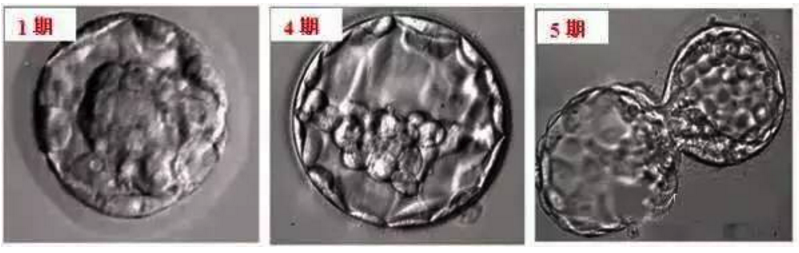 第一张(左)图片为一个1期的囊胚,第二张(中)图片为一个4期囊胚,级别记为4AB,第三张(右)图片为一个5期囊胚,级别记为5AA。
